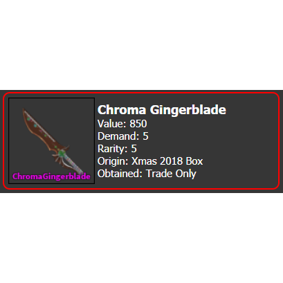 Chroma gingerblade is a chroma knife that was obtainable (by chance) through unboxing the 2018 christmas box during the christmas event 2018 roblox mm2 chroma. Mm2 trading #2 trading for chroma gingerblade.